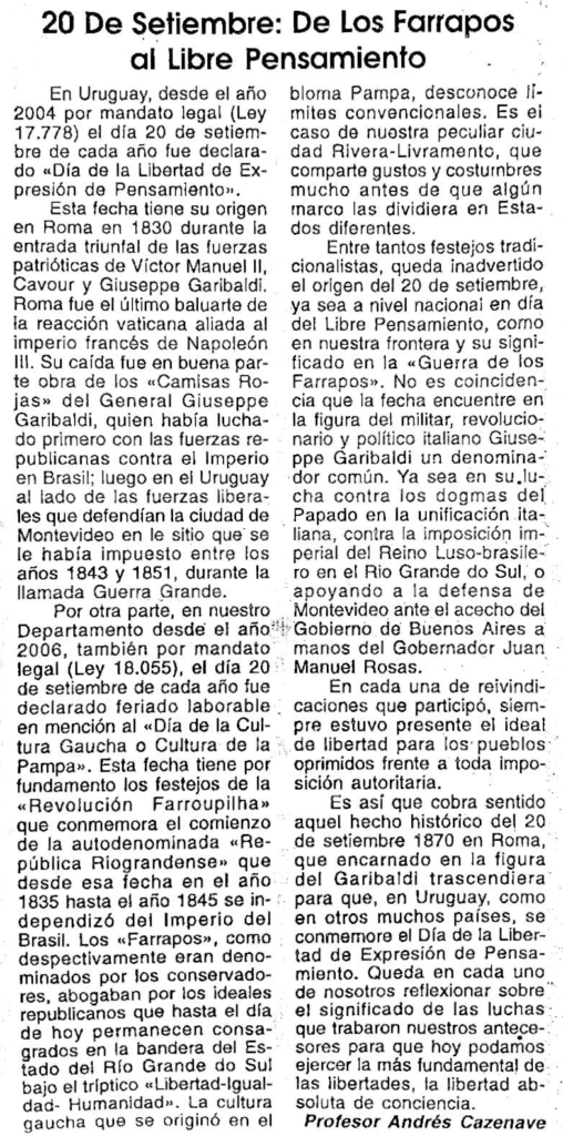 Entre tantos festejos tradicionalistas, queda inadvertido el origen del 20 de Setiembre, ya sea a nivel nacional en día del Libre Pensamiento, como en nuestra frontera y su significado en la “Guerra de los Farrapos”. No es coincidencia que la fecha encuentre en la figura del militar, revolucionario y político italiano Giuseppe Garibaldi un denominador común. Ya sea en su lucha contra los dogmas del Papado en la unificación italiana, contra la imposición imperial del Reino Lusobrasilero en el Rio Grande do Sul, o apoyando a la defensa de Montevideo ante el acecho del Gobierno de Buenos Aires a manos del Gobernador Juan Manuel Rosas.